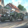 The Vanwalls of Stirling Moss and Tony Brooks are shown leading Juan Fangio at the 1957 Italian Grand Prix at Monza. Moss went on to victory and Brooks posted the fastest lap. This print has long been sold out in the primary market. Autographed by Stirling Moss, Tony Brooks, Frank Costin, and Juan Manuel Fangio. Certificate of authenticity provided with print.