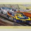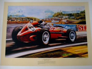This beautiful print was done as an edition of 500. The scene is taken from the 1958 Moroccan Grand Prix. World Champion Mike Hawthorn won Britain’s first-ever world driving championship in 1958 with a hard fought second place finish at the exotic circuit at Casablanca. The tall and always smiling Englishman drove his Ferrari Dino 246 into the record books and then, ever as good as his word, retired from the racing world at the young age of 29. He died in an automobile accident only a few months later in January of 1959.