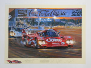 A limited edition of 500 prints depicting the winning Porsche 962 of Akin, Stuck and Gartner during the last Sebring 12 Hour to use the old airfield circuit in 1986. Autographed by drivers and signed by Nicholas Watts, the artist, too! Try to find this one with these signatures. Colorful print with Coca Cola Banner in background of the Coke Porsche 962.