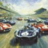 The Ford GT 40 MK IV was conceived and built specifically to achieve superiority over Ferrari and the other European marques that had dominated endurance racing throughout the 1960s. Twelve chassis were built by Michigan builder Kar Kraft for Shelby American, Inc, all featuring 427 cubic inch power plants. The goal was achieved at the 1967 24 Hours of Le Mans when the team of Dan Gurney and A.J. Foyt, driving the Number One serial number J-6, emerged victorious over the Ferrari 333P4 driven by Ludovico Scarfiotti and Mike Parkes. The edition is limited to 500 lithographic signed and numbered prints. Only 50 lithographic prints have been signed by Dan Gurney. Image area approximately 18 x 24.
