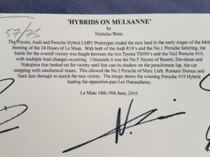 The artwork depicts winning Porsche 919 Hybrid leading the opposition past “Les Hunaudieres” (the Mulsanne Chicane) on its way to a historic victory at Le Mans.