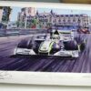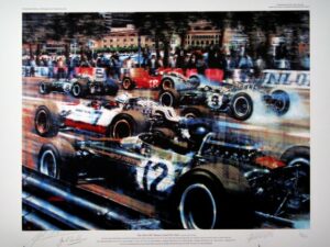 If you race Grand Prix Legends, you can run this race! This scene by noted motorsports artist Juan Carlos Ferrigno depicts the start of the 1967 Monaco Grand Prix featuring Jim Clark in the Lotus 33 Car No. 12. Jim Clark took the fastest lap of the race on lap 38, but was forced to retire on lap 42 when his rear suspension failed. Car No. 18 – Lorenzo Bandini – Ferrari 312 V12, three time F-1 world champion No. 8 Jack Brabham – Brabham BT 19 Repco, No. 9 Denny Hulme – Brabham BT20 Repco, No. 7 John Surtees – Honda RA 273. The race was subsequently won by Denny Hulme driving the Brabham BT20, who became the 1967 Formula One World Champion. This print was published by Freck’s Auto Art, Inc. and the edition was limited to 850 signed and numbered prints.