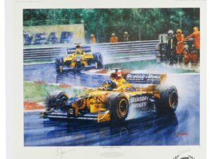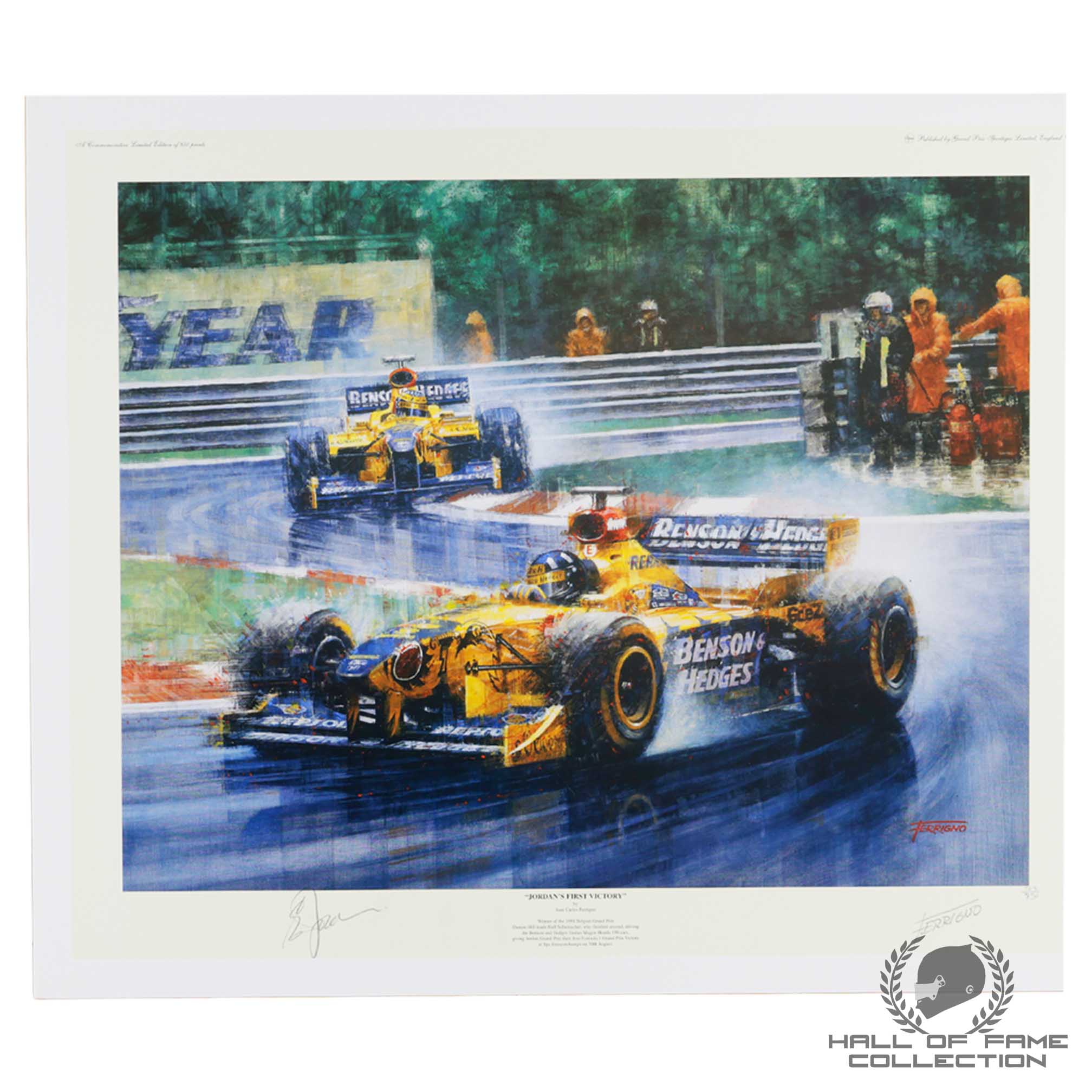 Artist: Juan Carlos Ferrigno Dimensions: 25 x 21 A classic vintage Formula One racing print taken from an original painting by Juan Carlos Ferrigno. This striking scene depicts Damon Hill, winner of the 1998 Belgian Grand Prix leading his team mate Ralf Schumacher, to give the Jordan Grand Prix Team their first Formula 1 Grand Prix Victory. The edition is limited to 850 artist-signed and numbered prints, personally autographed by team owner Eddie Jordan. Autographed by Eddie Jordan!