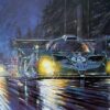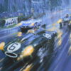 Limited edition giclee of 50 produced from an original painting by Nicholas Watts. This scene highlights a memorable image from the 1953 Le Mans featuring the 2nd place Jaguar C Type with Stirling Moss driving as they exit the Esses and line up for Tertre Rouge. Following is the Levegh/Pozzi Talbot Lago as they pass the Alfa Romeo 3000CM of Sanes/Carini. Hand autographed by Sir Stirling Moss and Norman Dewis.