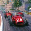 This exciting racing scene is a limited editon of 50 giclees produced from an original painting by Nicholas Watts. It highlights the great racing driver Sir Stirling Moss leading the pack at Nurburgring. Hand autographed by Sir Stirling Moss.