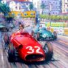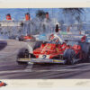 This stunning print features Rubens Barrichello driving the Stewart-Ford to 2nd place in the 1997 Monaco Grand Prix rain, finishing just behind Michael Schumacher. John Saunders was the winner of “Grand Prix Sportique’s 2nd Annual International Motor and Motor Racing Art” competition supported by Ford Motor Company. Judged on September 12, 1997 by Derek Bell, Nick Mason, David Mills, Sir Stirling Moss, Ken Reeds, Craig Warwick, and John Fitzpatrick.
