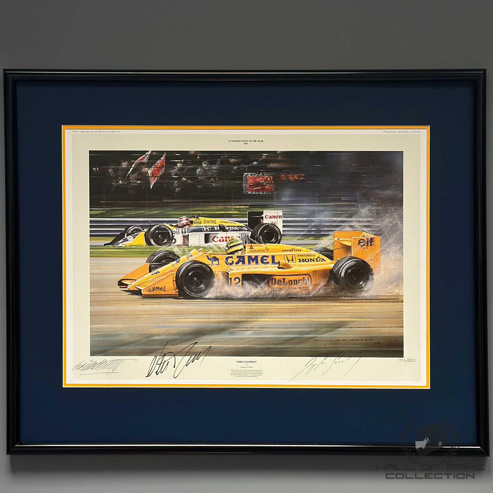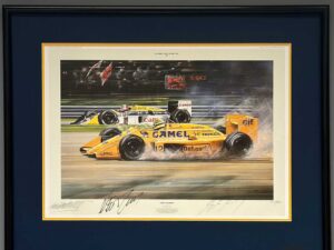 This print, by famed racing artist Nicholas Watts, portrays an event held in 1987. The drivers are three-time world champion Nelson Piquet, dueling with world champion Ayrton Senna. The Lotus Honda of Ayrton Senna plows through a runoff sand trap after running wide at the Parabolica during the 1987 Italian Grand Prix at Monza. This allowed Nelson Piquet in his Williams Honda to achieve victory, ultimately providing him with his third driver’s World Championship title. The edition was limited to 850 signed and numbered prints.