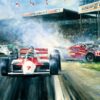 This edition is limited to 495 and is by artist Roger Warrick. It was published by Freck’s Auto Art, Inc. in 1999. Jimmy Vasser crosses the line winning the inaugural US 500 and the Vanderbilt Cup. Averaging 156.4 miles per hour, Vasser drove his backup Renard 961 Honda after his pole-winning car was eliminated in a start line crash. The race was held at the Michigan International Speedway on May 26, 1996.