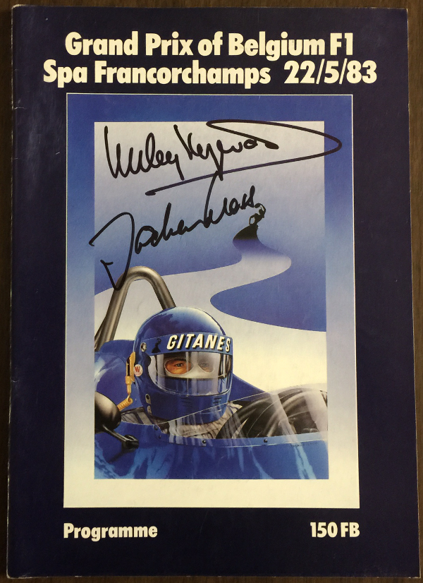 The 1983 Belgian Grand Prix was a F1 race held at Spa-Francorchamps on the 22nd of May, 1983. After a period of 13 years, Formula 1 returned to Spa after the track was shortened. This was to be the first Formula 1 race held on the modern Spa circuit. Alain Prost driving from pole position won the race for Constructor Team Renault. Finishing second was Patrick Tambay for Team Ferrari with Andrea de Cesaris finishing third on the podium driving for Team Alpha Romeo. This meticulously blue covered 8 1/2” x 11 1/2” program is in overall excellent condition, and it is collectible. This program is autographed on the cover by Hurley Haywood, 3 time Le Mans winner, and Jochen Mass 1989 Le Mans winner.
