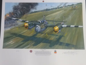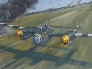 Carrying the markings of the USAAF 55th Fighter Squadron, the Lockheed P-38J “California Cutie” flown by Richard Loehnert is depicted during a low level strike against a Luftwaffe airfield prior to the Normandy invasion. Based at Kings Cliffe it is bedecked in invasion stripes and carries the triangular Squadron identification marking on the outside of the vertical tail surface. As the war progressed General Jimmy Doolittle turned the fighters of the Eighth Air Force loose from their bomber escort roll allowing them to “freelance” and attack such targets of opportunity. Strafing attacks were considered to be exceedingly dangerous which was reflected in heavy losses inflicted on the USAAF fighter groups.