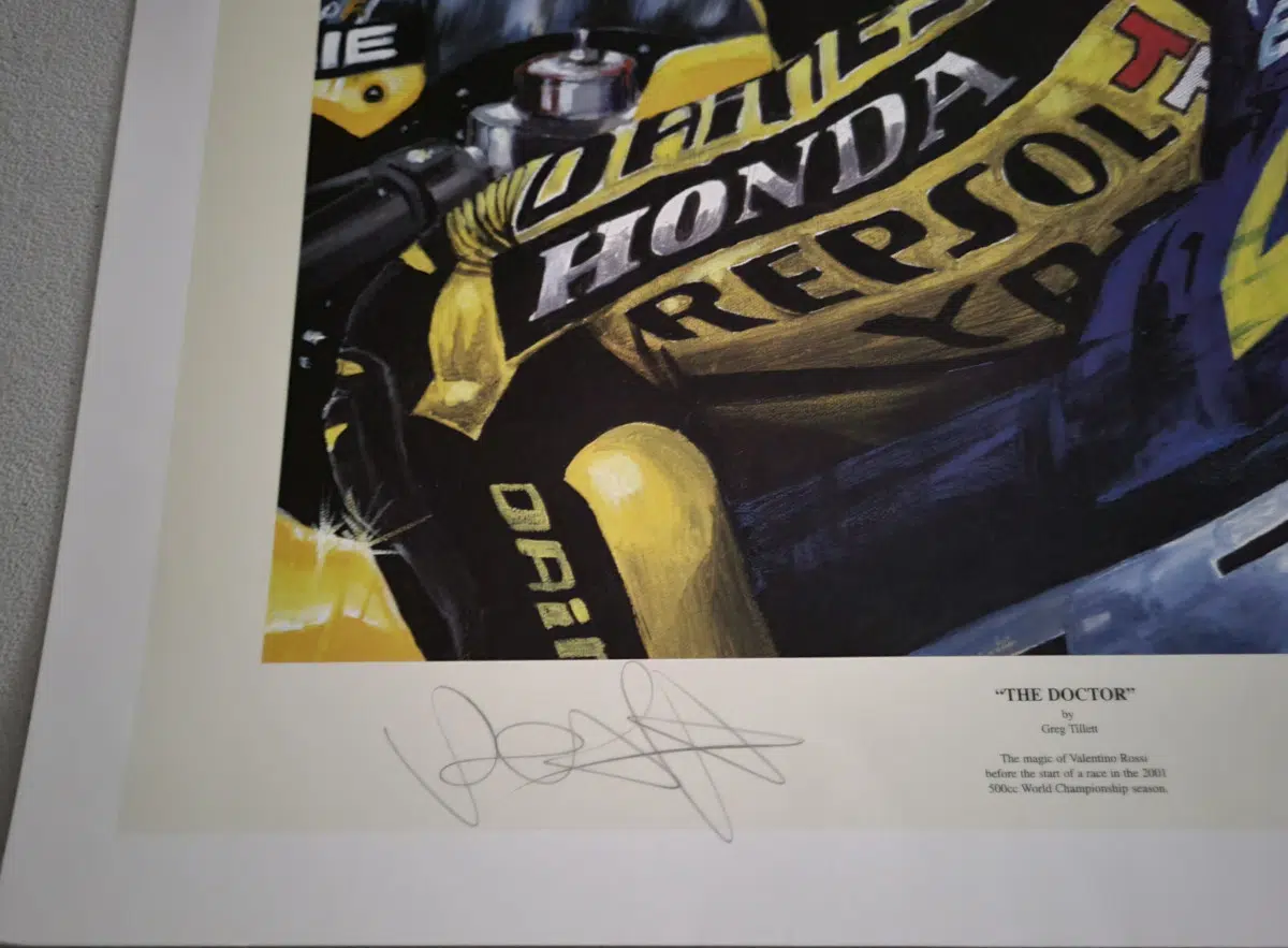 This limited edition print highlights Valentino Rossi on the NSR Honda 500, 2001. Rossi is surrounded by the border containing his signature, Greg Tillet’s signature, along with text.