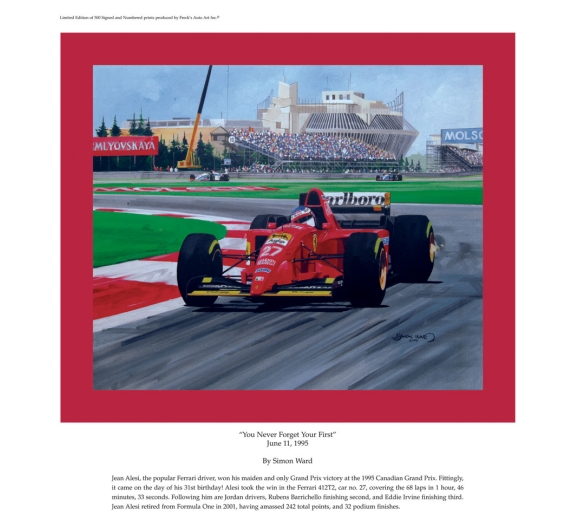 Jean Alesi, the popular French driver, won his maiden and only Grand Prix Victory at the 1995 Canadian Grand Prix in Montreal. Fittingly, it came on the day of his 31st birthday. Alesi took the win in the Ferrari 412T2 car number 27 and covered the 68 laps in one hour, 46 minutes, 33 seconds. Following him onto the podium were Jordan team drivers Rubens Barrichello, finishing second, and Eddie Irvine at third. Jean Alesi retired from Formula One racing in 2001, having amassed 242 total points and 32 podium finishes.